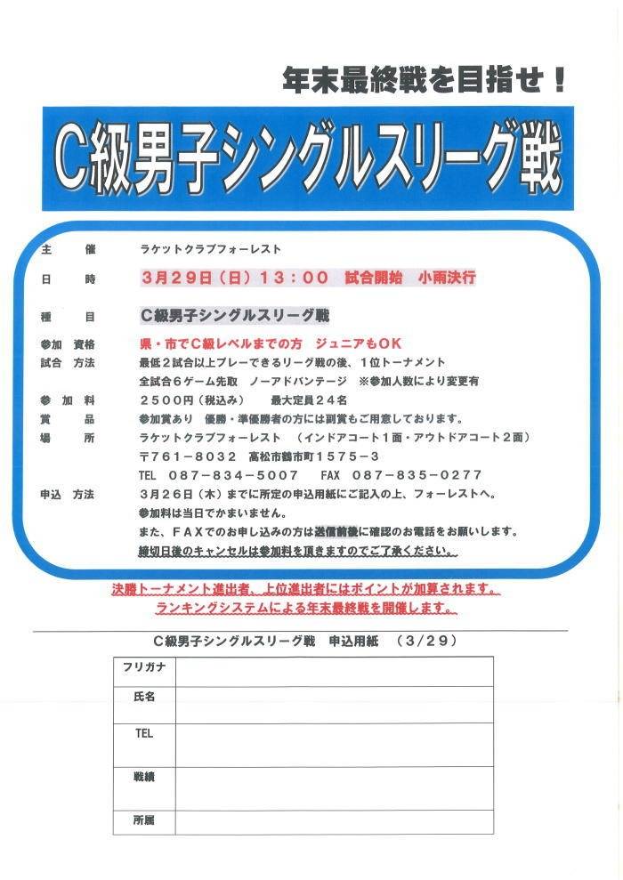 C級男子シングルスリーグ戦のお知らせ(3/29)