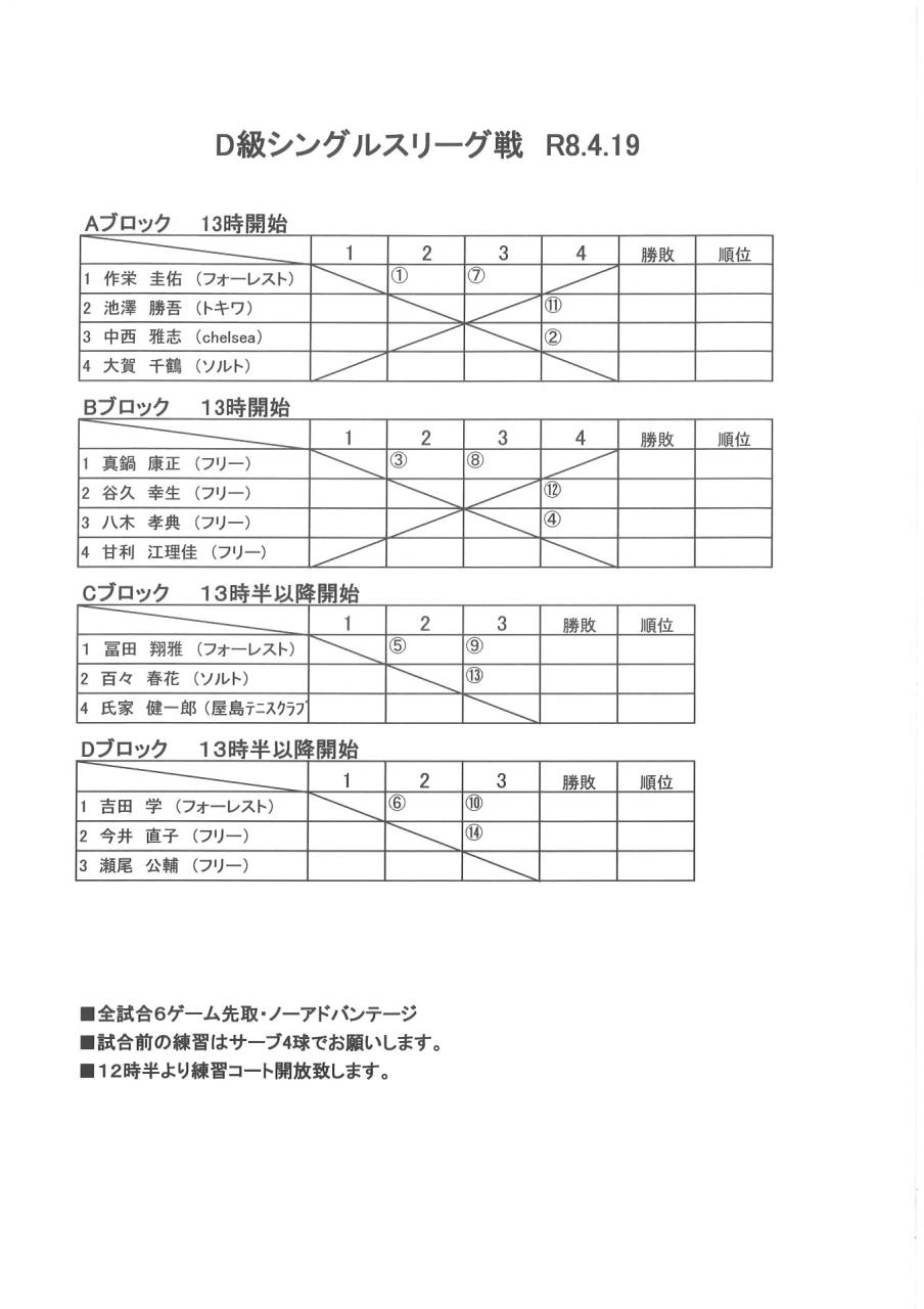 D級シングルスリーグ戦ドロー(4/19)